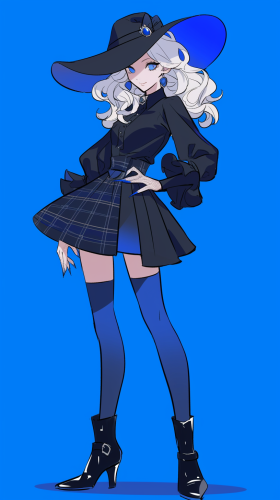 Furina modern outfit, Genshin Impact, female,Persona 5 style, Create an image of Furina from Genshin Impact, reimagined in the dynamic and stylized art style of Persona 5. Furina should be depicted with sharp, angular lines and bold, high-contrast shading, capturing her elegant yet mischievous character. The background is a vivid blue, f. Furina’s pose is playful and confident, with a sly, charismatic expression that hints at her cunning nature. --ar 9:16 --niji 6