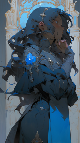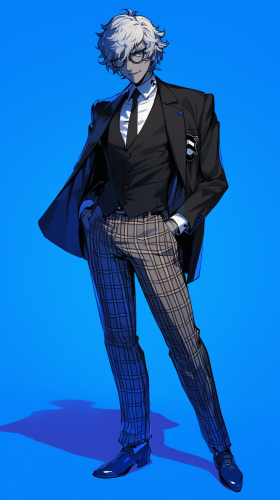 Neuvillette modern outfit, Genshin Impact, male,Persona 5 style, Create an image of Neuvillette from Genshin Impact, reimagined in the sharp, stylized art style of Persona 5. Neuvillette should be depicted with angular lines and bold, contrasting shading, emphasizing his composed and authoritative demeanor. The background is a vibrant blue. Neuvillette’s pose is dignified and commanding, with a calm, resolute expression that conveys his sense of justice and strength. --ar 9:16 --niji 6