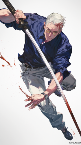 Imagine Kento Nanami from "Jujutsu Kaisen" in the style of a Genshin Impact character. Full-body shot, white background, anime art style, fantasy concept design, 2D game art. Nanami is depicted in a full-body pose, mid-action, executing a precise and powerful move with his signature blunt sword. His serious expression and distinctive glasses stand out, reflecting his calm and calculated nature. He holds his sword ready to strike with his Ratio Technique, exuding a strong and disciplined aura. High quality, masterpiece, 8k. --ar 9:16 --niji 6