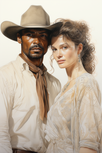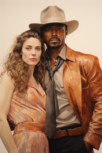 color pencil drawing of 1970s gangsters from Denver, skinny white female with brown hair shinny tooth and african american male with cowboy hat and goatee in the style of Olivia De Berardinis outstanding cinematography, 16mm, 80s photo, 35mm, grain, medium format, 8k, highly detailed, 1980s photography, 1970s fashion, 1970s america, colorphoto, --ar 2:3 --s 250