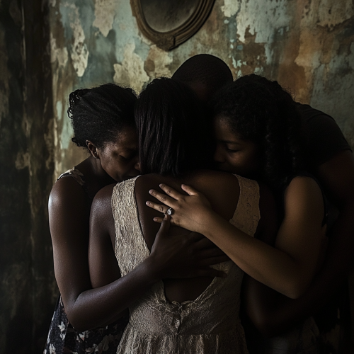 black family reunion in an old and battered house, brothers and sisters hug their mother for the imminent departure of their children who will cross the Mediterranean to immigrate to Europe. dark and melancholic photography, various points of view, realistic photography