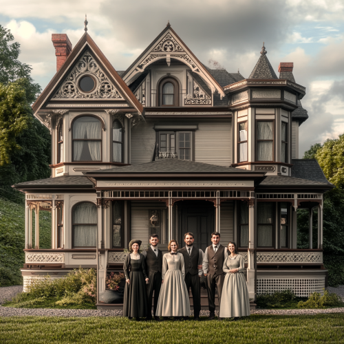 old Victorian house with 6 house member standing in the front in modern clothing and of different backgrounds they are smiling with detailed faces 8k resolution