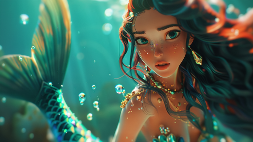 beautiful mermaid named Marina with shimmering scales lost her tail. cartoon illustration, 8k Hdr --ar 16:9