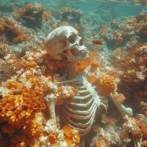 vintage withered photo of an extremely cute woman skeleton swimming an alien habitable underwater planet, coral reefs, liminal space atmosphere, water, plants, chaotic, serenity, rough ocean, tansparent water, reefs, fish, coral, inner peace, awareness, silence, nature, evolution, --ar 1:1 --s 750 --v 6.0