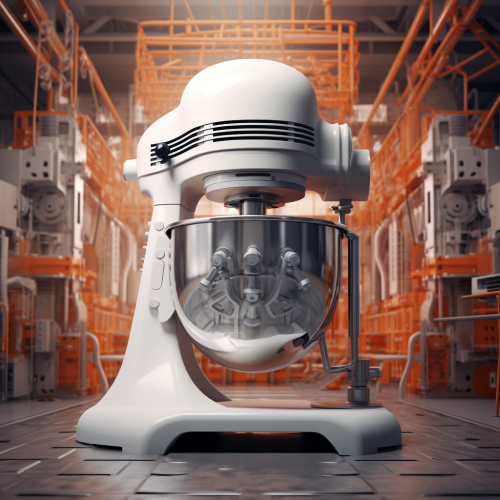 a stainless steel table with a stand mixer on top of it, product photography style, with cool lighting coming from the front and right, and a darkish background. Sort of zoomed in, the entire table should not be visible