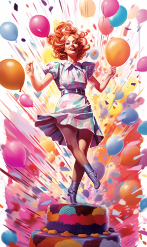 A gorgeous woman jumping out of a big birthday cake, balloons and confetti, celebration , bold colors, brushwork and airbrush, J. C. Leyendecker, i shuxing, multiple flash, expressive and cute, --ar 3:5 --s 200 --niji 5