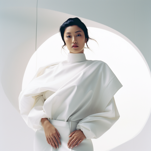 The full - long shot half - body photography, isolating from the completely white bright background, of a beautiful 40 - year old Asian - Japanese female, mysterious mixed vibe between Off White Simplicity Minimalistic, Renaissance knight, Futuristic Space Crew, and Japan 80s City Pop, asymmetry balancing posing, stylistically inspired by Agnolo Bronzino, Johannes Vermeer, Gustav Klimt, Caspar David, Alex Katz, and Gustave Courbet. Real Texture, Real Skin, rim lighting, Real Skin, Rim Light, Warm Light, DOF, Sharp Focus, ultra - realistic, using Canon EOS6 23mm F/ 1. 8
