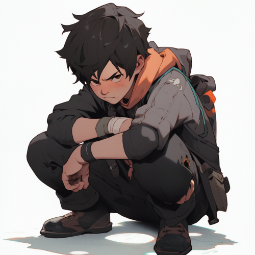 male character, crouched fighting stance, xiao tong, black hair, tired eyes, grumpy expression --s 750 --niji 5