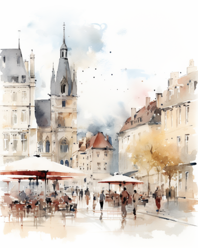 quick minimalist watercolor sketch, expressive, view of the main square of Dijon France, dark grey-beige tones with burgundy accents, isolated on white background --ar 4:5