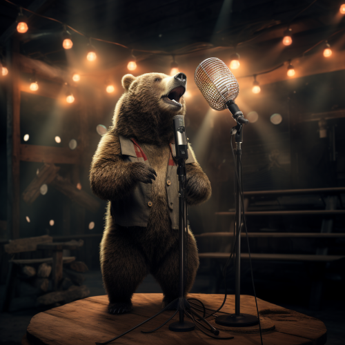 a bear standing in a spotlight with a mic and mic stand and stool, photo realistic