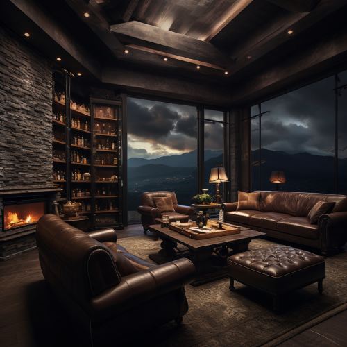 cozy luxury cigar room, it’s snowing, in peak of mountain