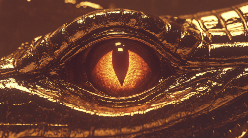 Movie scene, Polaroid style, close angle crocodile eye red, many details, skin crocodile in gold, a 80's horror image closeup of a crocodile red eye hunting in the beach, closeup, 1980s metal artwork, 80's horror cover, scary creepy 80s horror movie vhs cover, closeup of the crocodile eye, vhs cover art, closeup of the shiny orange eye, 1 9 8 0's heavy metal album art, metal album cover art, still from (1980) --ar 16:9 --sref 1435990713