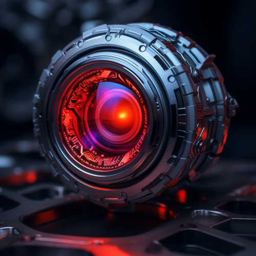 cybernetic eye, neon light, black table, blurred background, hyperdetailed photography, photorealistic. Canon EF 16-35mm f2.8L III USM lens on a Canon EOS 5D Mark IV camera