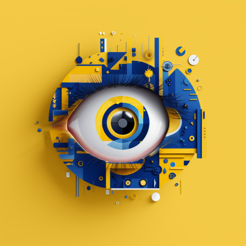 brand identity 2d flat eye blue and yellow with branding elements over a yellow and blue background