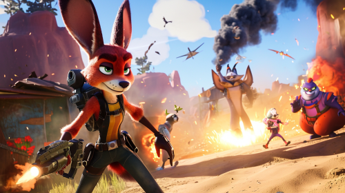 a Fortnite style battle between Disney and Loony Tunes characters. --ar 16:9 --v 6.0