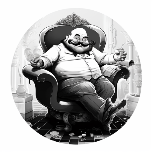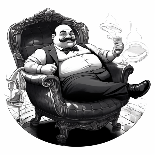 black and white picture of a fat bald man with a curly mustache sitting in a claw foot bathtub smoking a pipe, loony toons style art