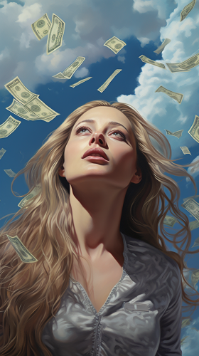 a woman's face with dollars instead of pupils and with bills in her mouth looks forward, long hair, Sky, Space Fiction Illustrations --ar 9:16
