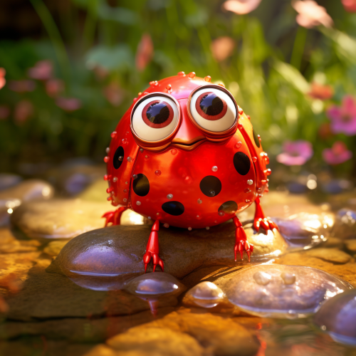 (*pixar style, Lulu, the plucky ladybug, embarking on a vibrant garden adventure with her shimmering red spots.