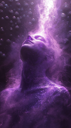 A glowing purple humanoid figure lying on its right side with its legs facing forward, toward the viewer. The figure's mouth is slightly open in a peaceful, dream-like sleep, and its body emits a soft, ethereal purple glow. Rays of light gently illuminate the upper body, creating a serene and mystical effect. Wisps of smoke rise upward from the figure’s head, symbolizing dreams or spiritual energy. The background is filled with countless eyes of various sizes, watching the figure with a sense of mystery and spiritual awareness. The eyes are both curious and protective, adding to the dreamlike atmosphere. --ar 9:16 --s 750