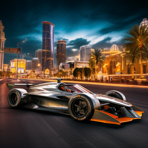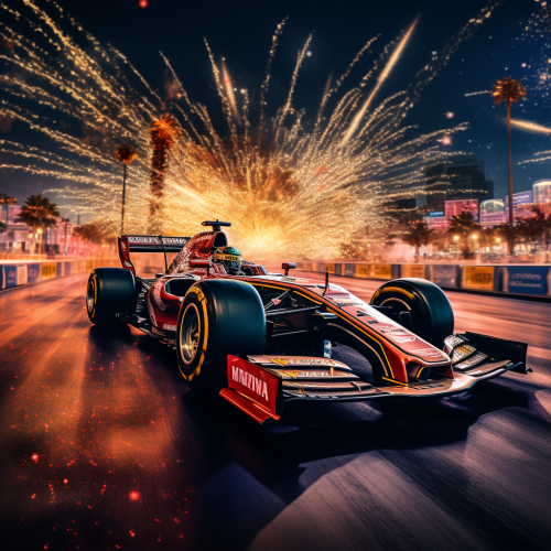 f1 car with the specific letters "KOCF" to appear as their main logo as well as crowns, which makes up their livery. The background is the best view of the Las vegas grand prix, with fireworks in the sky.