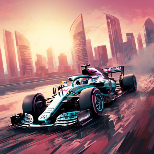 a artistic poster showcasing lewis hamilton with mercedes f1 racing car with doha skyline as background for Qatar GP