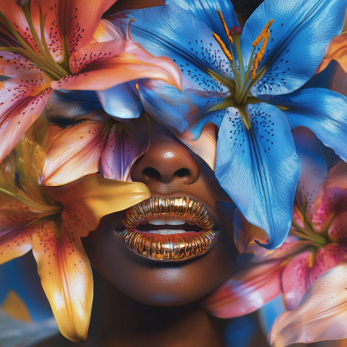 "Surreal portrait of a Black melanated girl with gold grillz on her teeth, her face partially obscured by vibrant, multicolored lilies covering her eyes. The lilies, in shades of blue, orange, pink, and white, cascade elegantly across her face, blending seamlessly into her skin in an ethereal, dreamlike manner. Her serene expression contrasts with the bold shimmer of her gold grillz, and the background softly fades into an abstract, art-like blur. The image exudes a surreal, otherworldly vibe, blending beauty, strength, and artistic surrealism.
