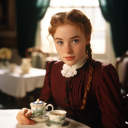moment when Anne Shirley, in her eagerness to impress the guests at Green Gables, serves raspberry cordial during a tea party. However, instead of raspberry cordial, she accidentally serves currant wine. Anne realizes her mistake too late as everyone starts to feel the unexpected effects of the 'cordial.' Capture the expressions of shock, surprise, and Anne's frantic attempts to rectify the situation in a hilarious and memorable illustration