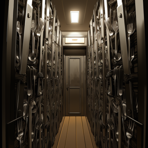an average-looking apartment elevator with only people-sized dinner forks riding in it, standing up, POV from inside the elevator