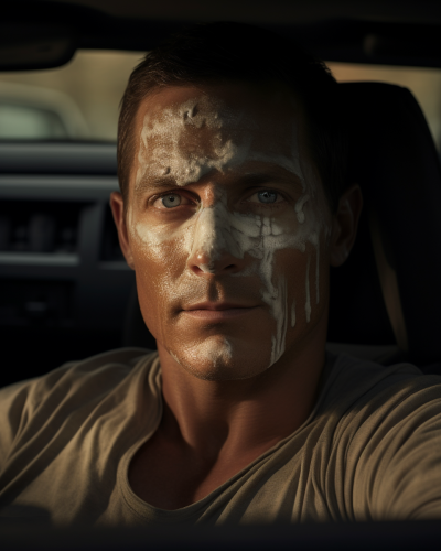 bear grylls relaxing inside an SUV, he is wearing a spa facial mask cream over his face, close up shot, photography, realistic --ar 4:5