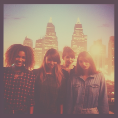 : hazy polaroid picture, wild girls night out, blended friend group, different races and different body shapes, city life, flash effect. leave out no detail.