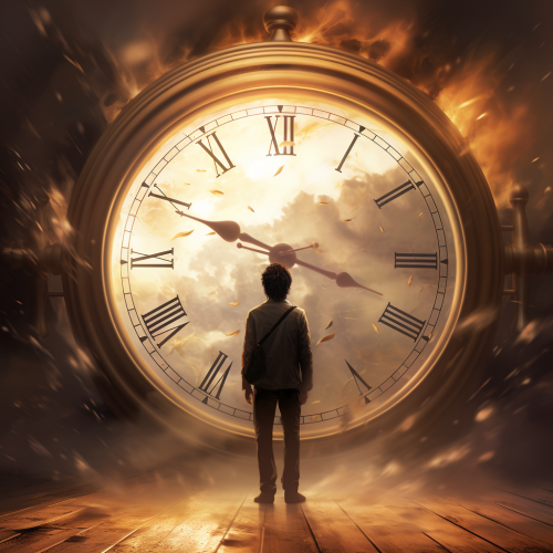 man standing in front of a clock. The clock is set to 11:11. The setting is dreamy, light colors with a dim golden light humming. A small portion of the clock is fading to dust and the dust is drifting away in the wind.
