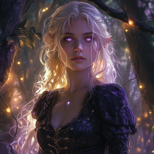 a fae woman with white blonde hair and light purple-colored eyes standing in a dangerous forest, you can see her whole body, she is wearing nobles clothing --s 250
