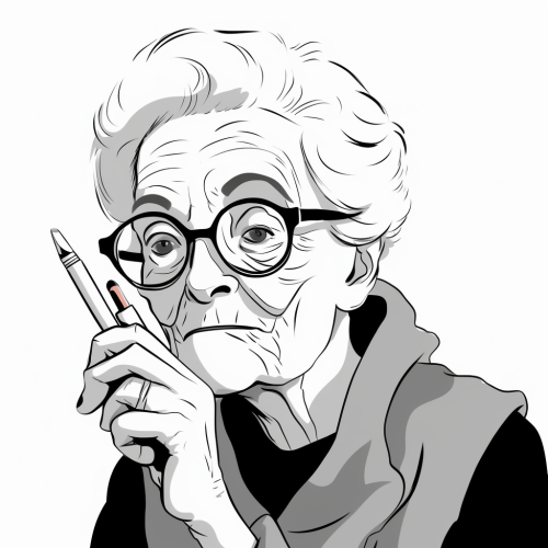 minimal vector cartoon of a cool old woman holding a marker in the style of Milton Glaser, black and white only --v 5.0
