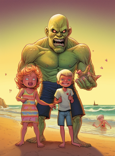 an image in the style of a goosebumps cover featuring a three year old boy with short blond spikey hair, a mexcian woman, and a bald white man, on a beach with a monster in the background --ar 11:15 --v 5.0