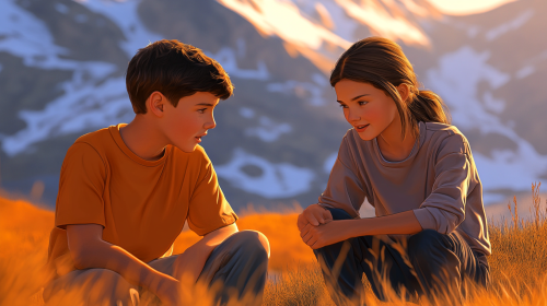 realistic colorful Illustration, photorealistic two teenage boys 12 years old and one girl 11 years old are friendly talking against the background of a mountain. warm colors, --ar 16:9