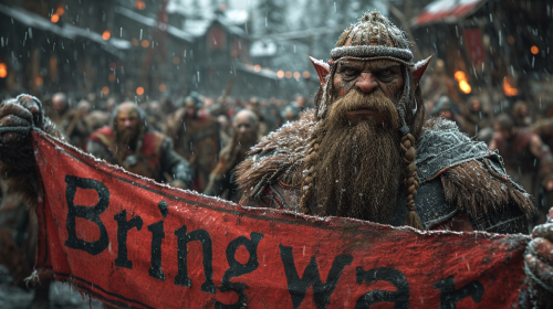 a banner that says very aggressively "Bring The War" stretched out in the middle of a battlefield. There are orcs fighting elves who are fighting dwarves in the battle --ar 16:9 --v 6.0 --style raw --s 750