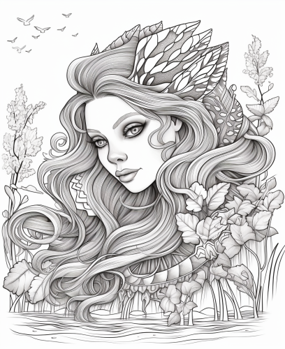 coloring page for adults, forest fairy with animals, cartoon style, thick line,high detailm, no shading --ar 9:11