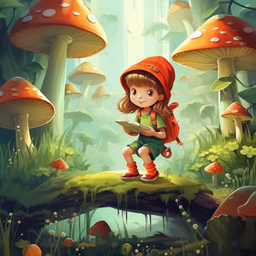 nice book cover for children fairy tales, green forest with mushrooms, cartoon style