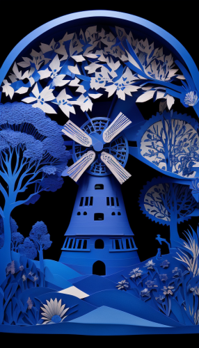 A Cobalt Blue magical Windmill on top a hill with oak trees and flowers surrounding it done in Paper cut out style --ar 9:16 --v 4
