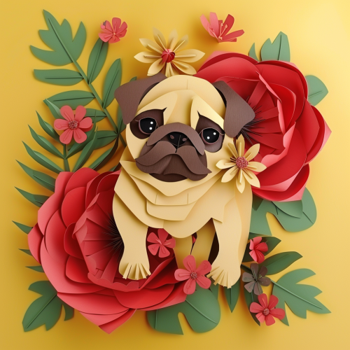 Draw a cute pug, flower, paper-cut, paper-cut style, three-dimensional, 3d, 8k