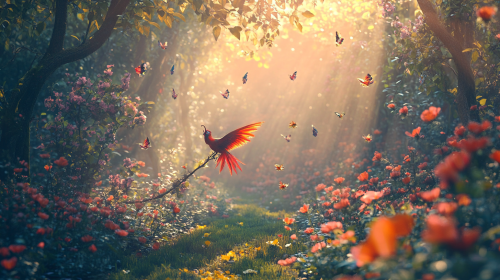 Create a fairy tale forest with flowers and trees in the forest there is a path on a branch in the foreground sits the Firebird hero of Russian fairy tales in red-orange colors around her flying multicolored flowers magical glow light haze view in perspective additionally around fly paradise hummingbirds that collect nectar in the sky red sun its rays illuminate the image of a fairy tale fantasy world, high quality --ar 16:9