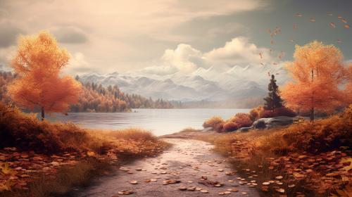 fairy tale design of autumn lake with the road to the nowhere in the middle with falling leafes and wind --ar 16:9