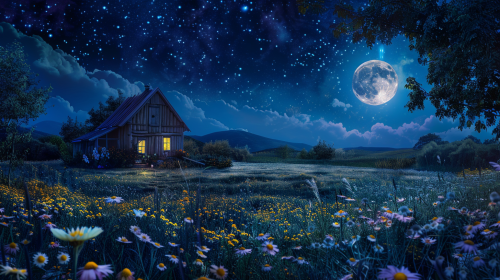 a male goldilocks and three bears at night outside a little cottage in the woods in the style of shadow box fairy tale story --s 50