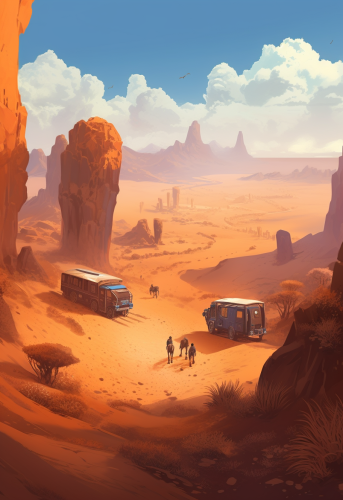 concept fairytale landscape art of desert with with a distant view of a traveling fantasy caravane with its colorful wagons and tiny figures of travelers --ar 64:93 --v 5.0