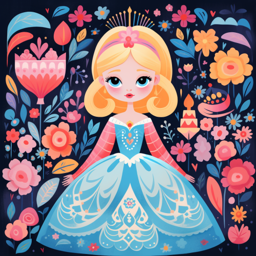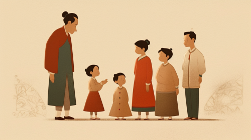 Simple gauache illustration of "a fairytale prince", mid - century children's book illustration, minimalist, on a neutral background, An endearing family portrait showcasing a Korean family, Standing in the order of mom, an adorable two-year-old son, a joyful seven-year-old daughter, and dad, standing hand in hand in a close-knit formation. Illustrate the scene with a front shot, emphasizing the familial bonds through their expressive faces and the unity conveyed by their interconnected hands, Illustration with a focus on vibrant colors --ar 16:9 --s 750 --v 5.0