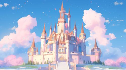The castle, with its pastel-colored roofs and white brick walls, resembles a fairytale-like dollhouse in the enchanting night, much like Cinderella's castle --ar 16:9 --niji 5