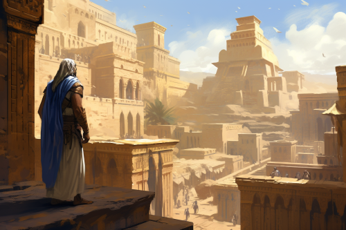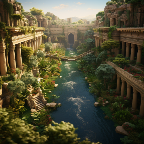 birds eye view of a sumerian city, babylon, hanging gardens, ziggurats, lush gardens, blotchy watercolor
