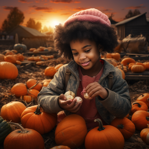 photorealistic afroamerican child playing with pumpkins on pumpkin farm autumn fall halloween, detailed, high quality