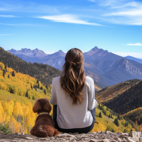 a skinny girl with short straight light brown hair sits on top of an American mountain in Colorado, next to her sits her dog a skinny,short hair and long ears Italian Spinone with a white body and light brown ears, it is autumn the trees are yellow orange and green and behind them you can see the endless horizon of mountains and glades