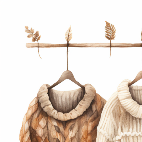 watercolor illustration fall knitting sweaters on hangers, white background, muted beige and white tones,